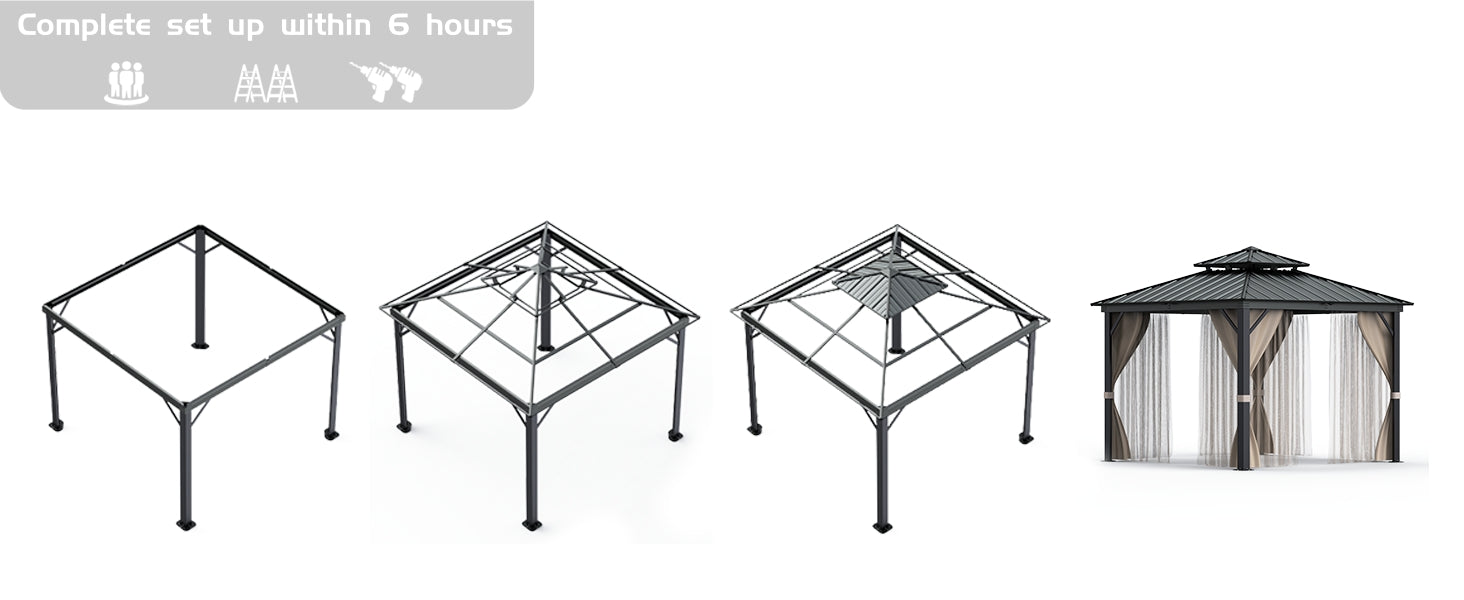 A : A detailed installation guide is included in the package; please prepare electric drills, gloves, and ladders. 2-3 people can complete the installation in about 6 hours.